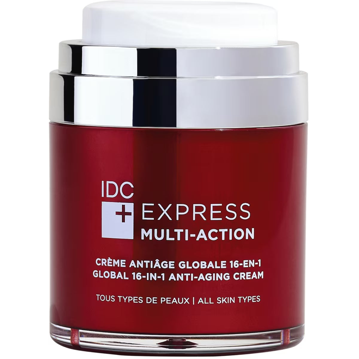 IDC Express Multi-Action is a 16-in-1 global anti-aging cream designed to simplify your skincare routine. This single product targets the face, eye contour, and neck, replacing up to seven individual products like serums, moisturizers, and eye creams for both day and night use. Formulated with a high 25% concentration of dermo-cosmetic ingredients, including Milk Thistle Extract, Inca Inchi oil, and peptides, it works to visibly improve firmness, smoothness, and hydration. The patented ReGen16 protocol addresses 16 signs of skin aging, helping to reduce the appearance of wrinkles, fine lines, puffiness, and dark circles while providing a powerful defense against environmental stressors.