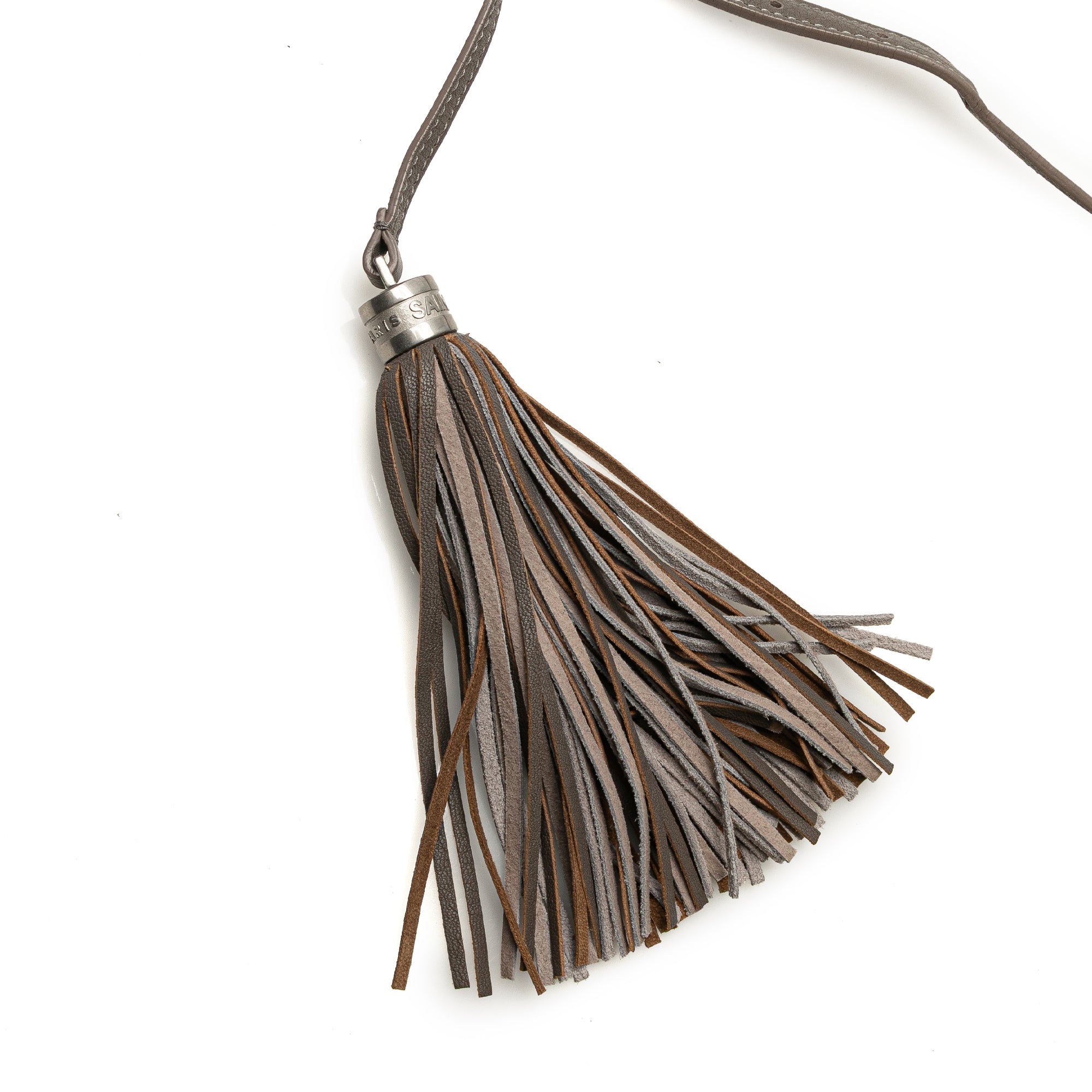 The Lou camera bag features a leather body, a tassel, an adjustable flat leather shoulder strap, a top zip closure, and an interior slip pocket.