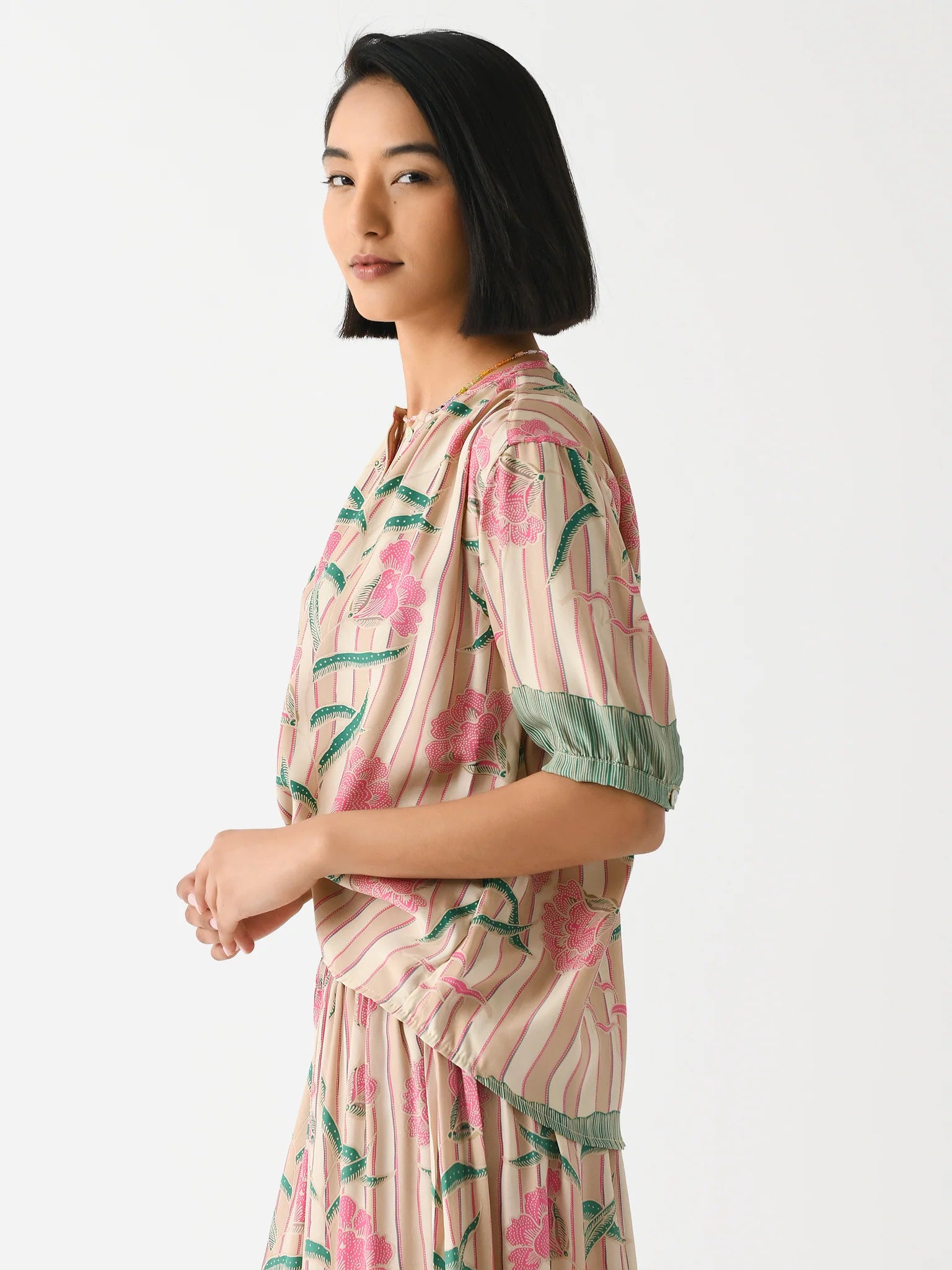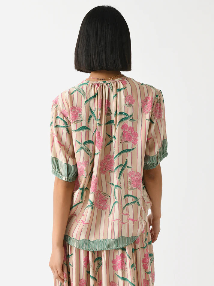 Description:   An easy-fitting blouse made from soft flowing silk featuring a custom print and shell buttons.