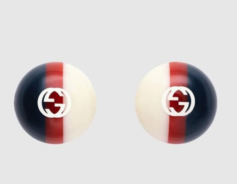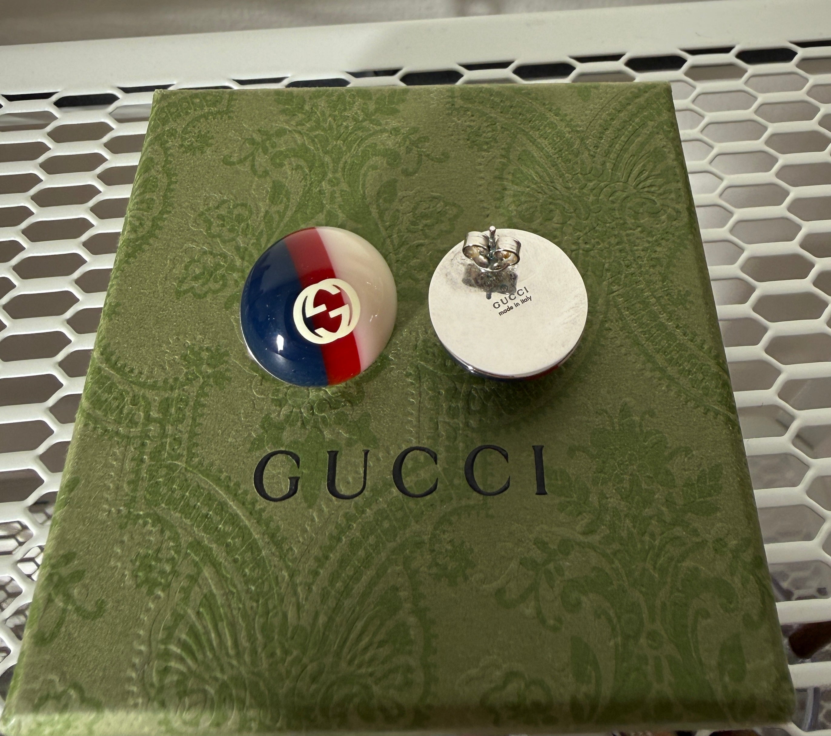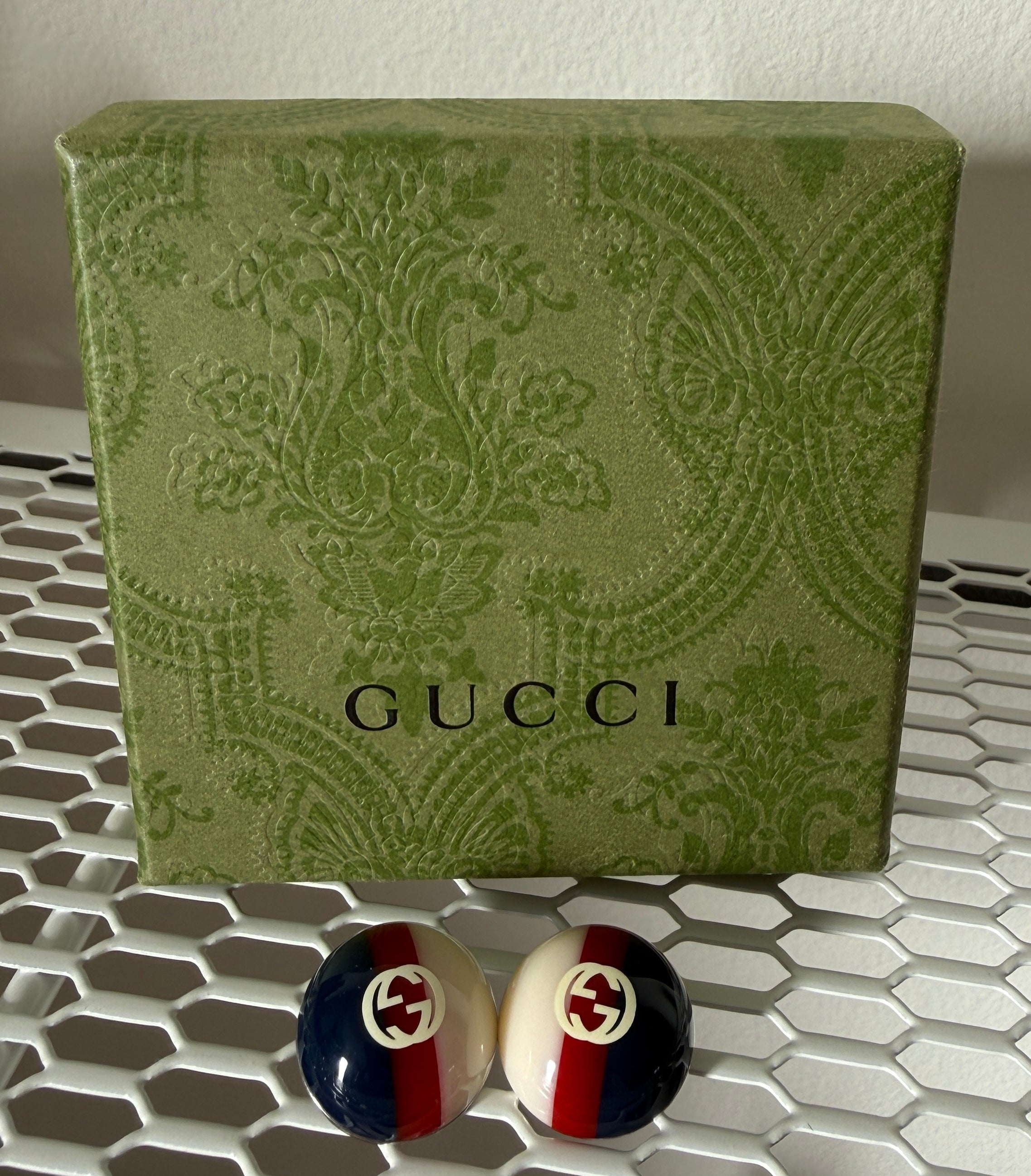 These exquisite earrings feature a striking red and blue enamel design, showcasing the iconic interlocking GG logo at the center. Crafted with a smooth, glossy finish, these spherical earrings embody the brand's signature elegance and style.
