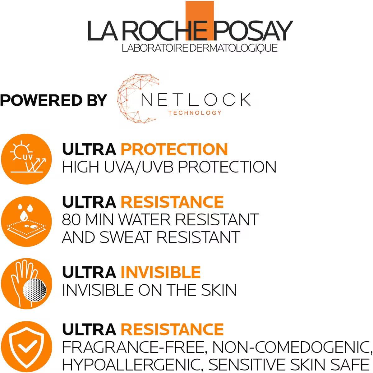 Discover the Anthelios Ultra Fluid SPF 50 Sunscreen, our best ultra-light and fragrance-free facial sunscreen, designed for invisible yet powerful protection. Featuring innovative NETLOCK Technology, it provides high broad-spectrum UVA/UVB defense that's ultra-resistant, with 80-minute water and sweat resistance and no eye migration. This weightless, non-greasy formula quickly absorbs to leave a mattified, invisible finish on skin. Clinically proven safe and effective for sensitive and sun-intolerant skin through extensive studies, it's also non-comedogenic and hypoallergenic. Protect your skin from sunburn and UV-induced damage with this ultimate, dermatologist-recommended solution.